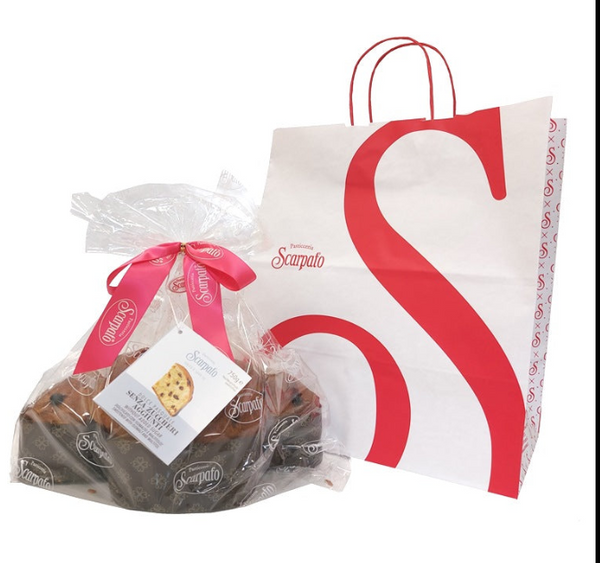 Packaged in a cellophane bag with the Scarpato logo, bow, and paper shopper.
