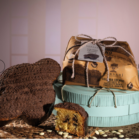 COLOMBA WITH WHITE CHOCOLATE CHIPS MELTED INTO THE DOUGH, FILLED WITH GIANDUIA CREAM, COVERED WITH DARK CHOCOLATE AND COCOA CRUMB, WITHOUT CANDIED CITRUS. BAKERY CONFECTIONERY PRODUCT WITH NATURAL LEAVENING.