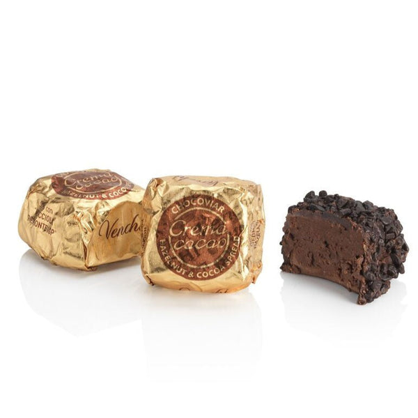 - VENCHI Chocoviar Crème Cacao is perfect for courtesy office and in a jobtime break. the Chocoviar Line chocolate in a bright golden wrapper. Chocoviar Crème Cacao is a dual identity chocolate (milk-dark): Gianduja chocolate milk filling and hazelnut paste in a double dark chocolate shell (56% and 75%) with dark chocolate granella on top of it. For this reason, Chocoviar Crème Cacao appeals to both dark and milk chocolate lovers. Chocoviars are packed in a simple and sturdy plastic bag, ready to be opened and emptied into a biscuit jar or onto a chocolate tray. The 1 kg bag size is perfect for those who want to make a small provision of chocolates without the extra cost of gift packs. The bag contains 53 chocolates, weighing about 18 g each. Average weight: 18 g/each. The whole bags are 1kg and for smaller orders the chocolates will be sorted and repackaged in hygienic food bags.
